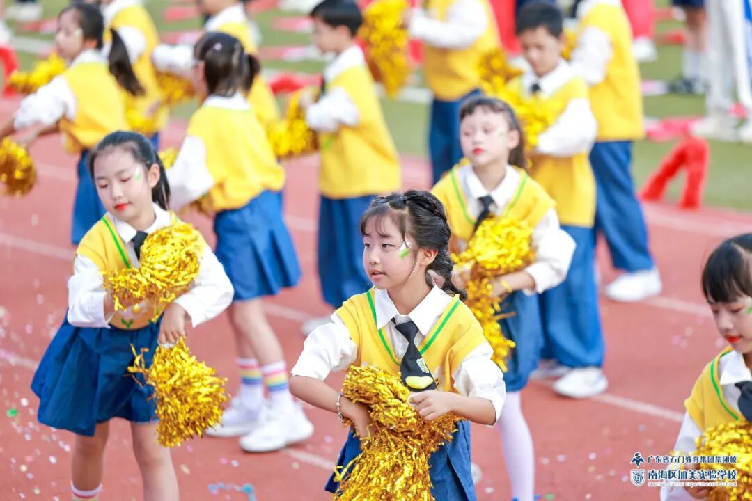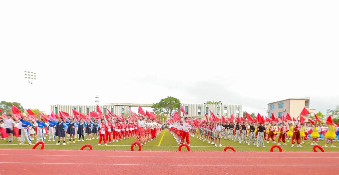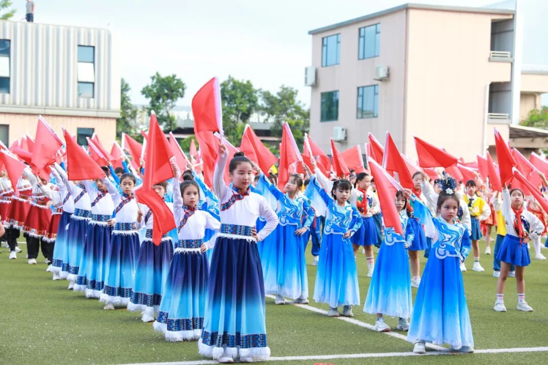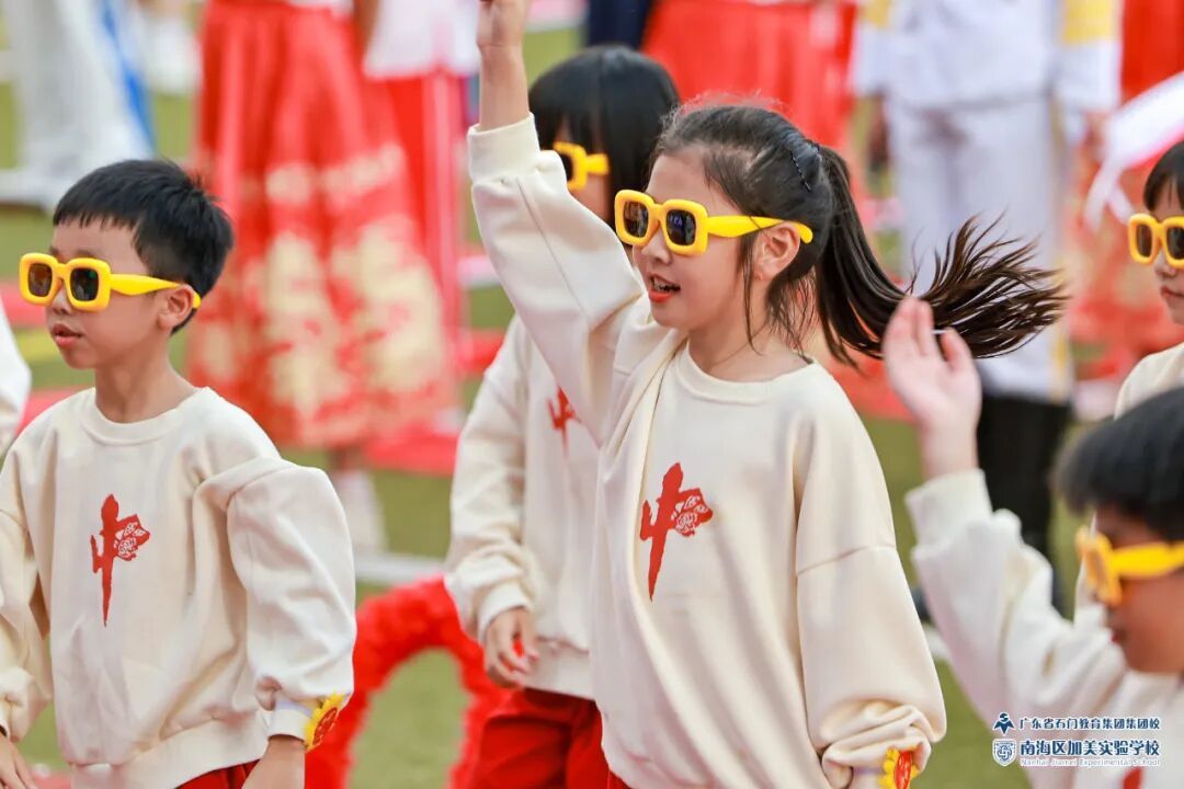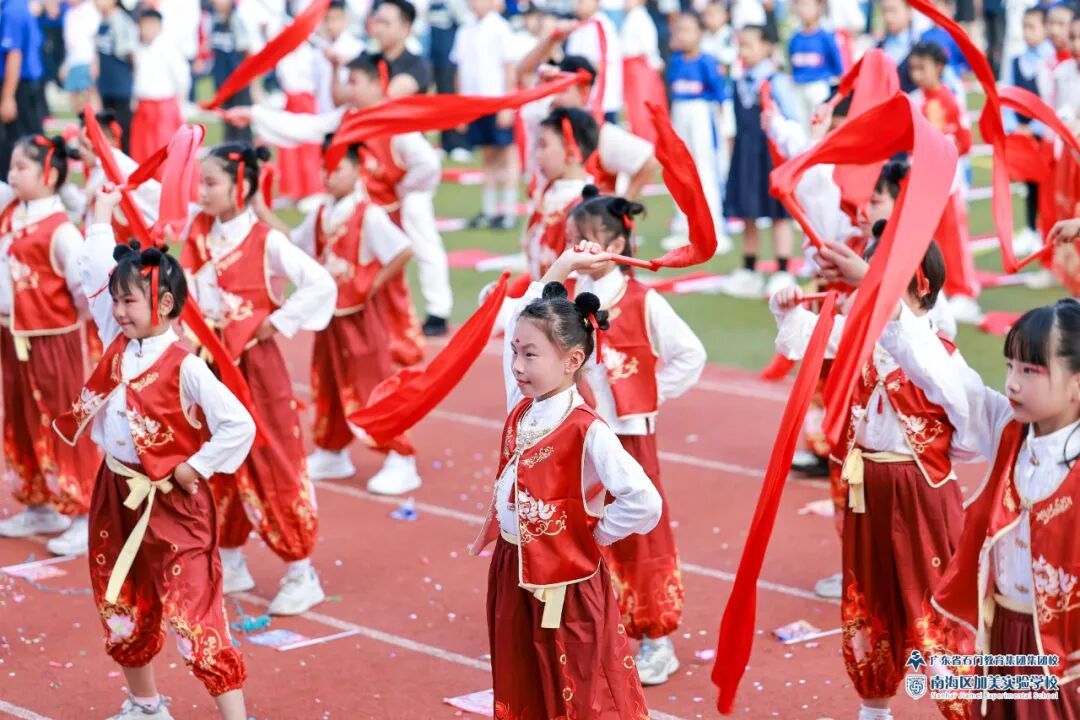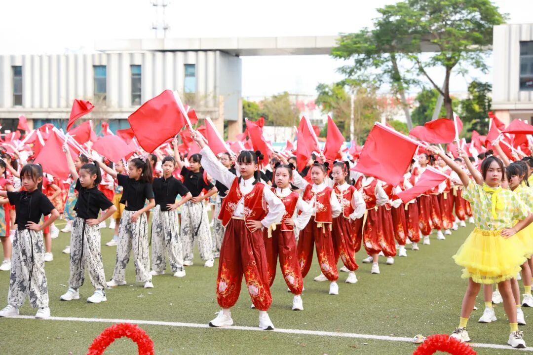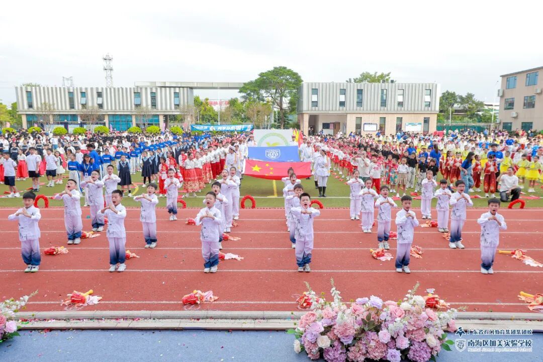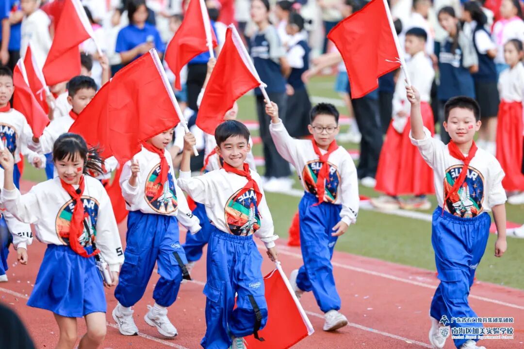 同学们手持彩旗,动作整齐划一,展现出新时代少年儿童的朝气与活力。飘扬的旗帜如同他们五彩的梦想,在加美校园上空飞扬。