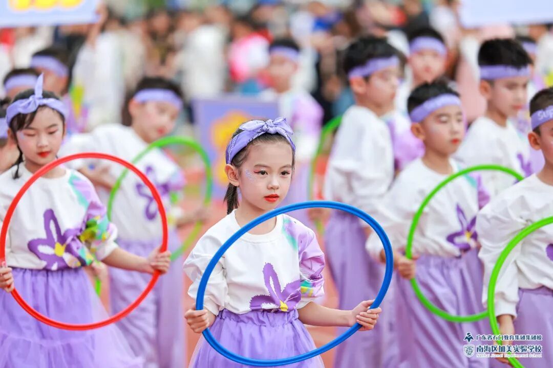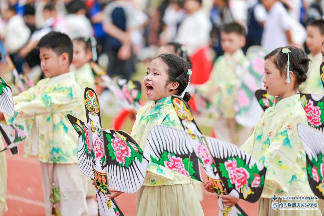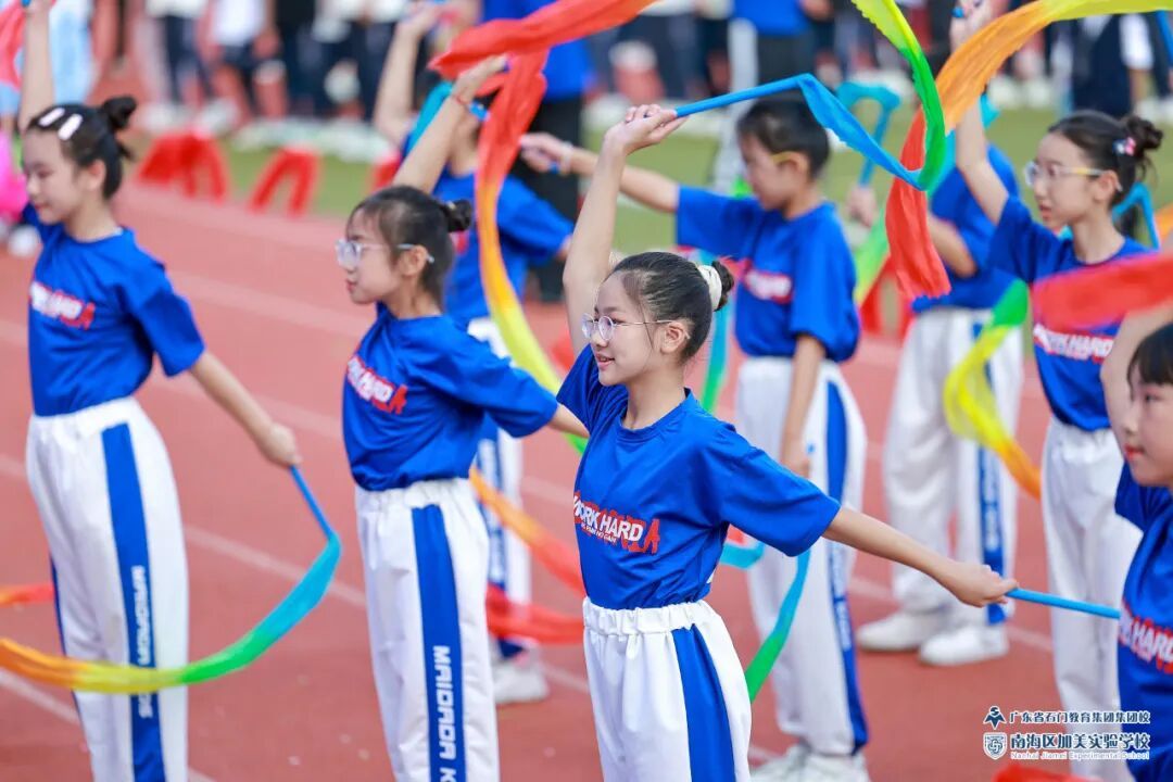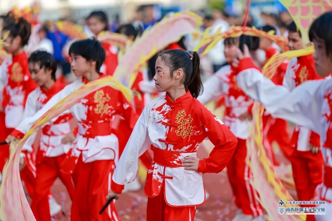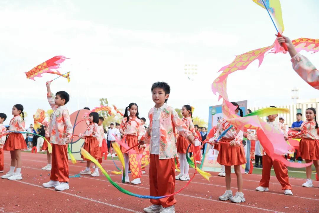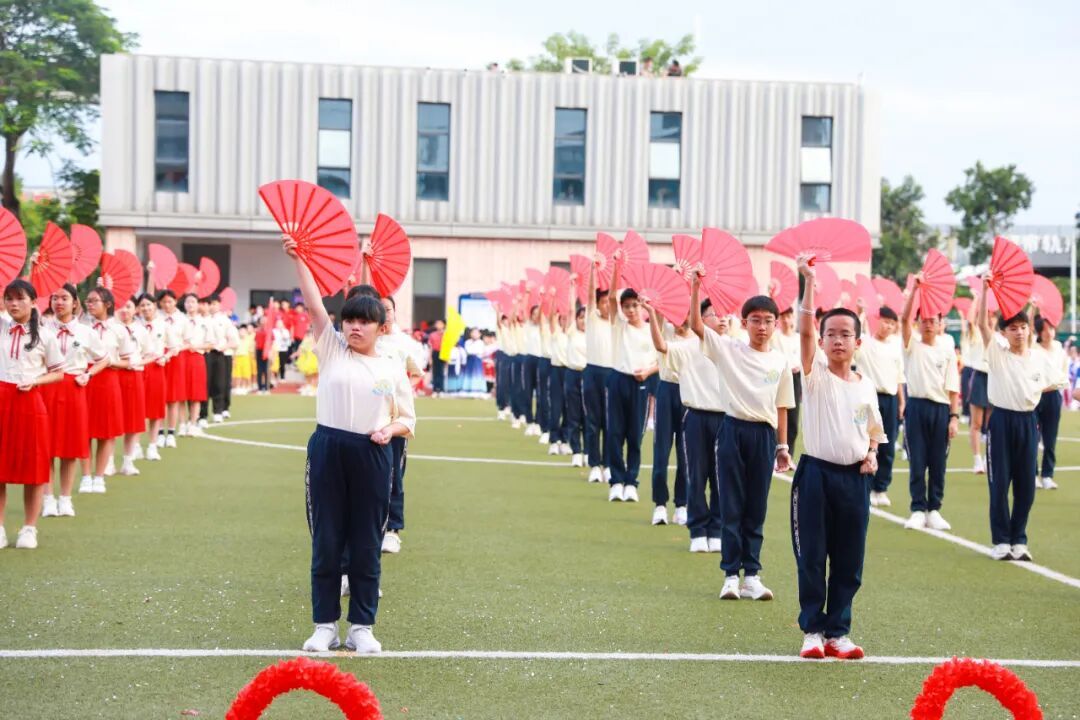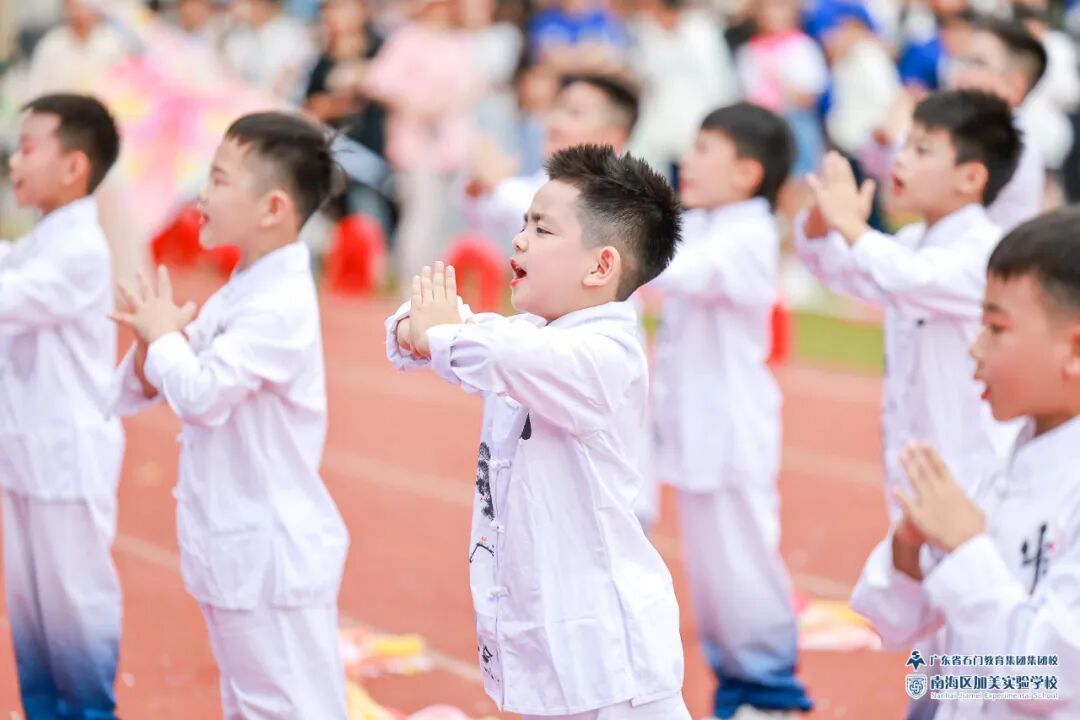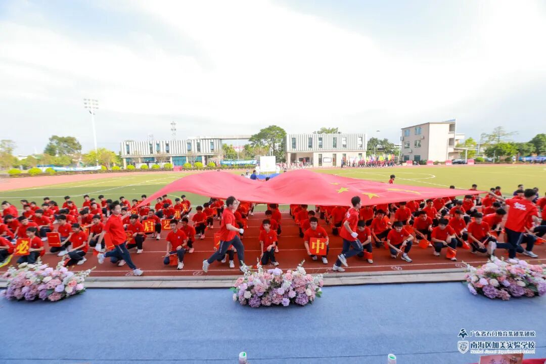 同学们手持彩旗,动作整齐划一,展现出新时代少年儿童的朝气与活力。飘扬的旗帜如同他们五彩的梦想,在加美校园上空飞扬。