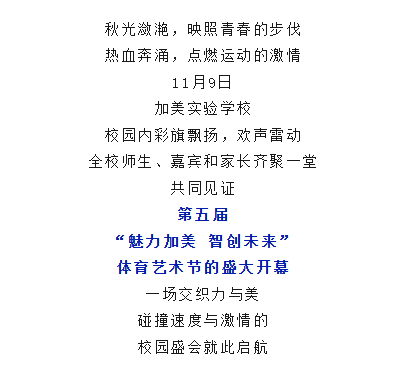 在接下来的两天里,运动场上将有奋力冲刺的身影,艺术舞台将有悠扬动人的歌声,加美学子将用激情与才华营造向真、向善、向美、向上的校园文化氛围,并将美育与体育成果固化于校园环境之中。