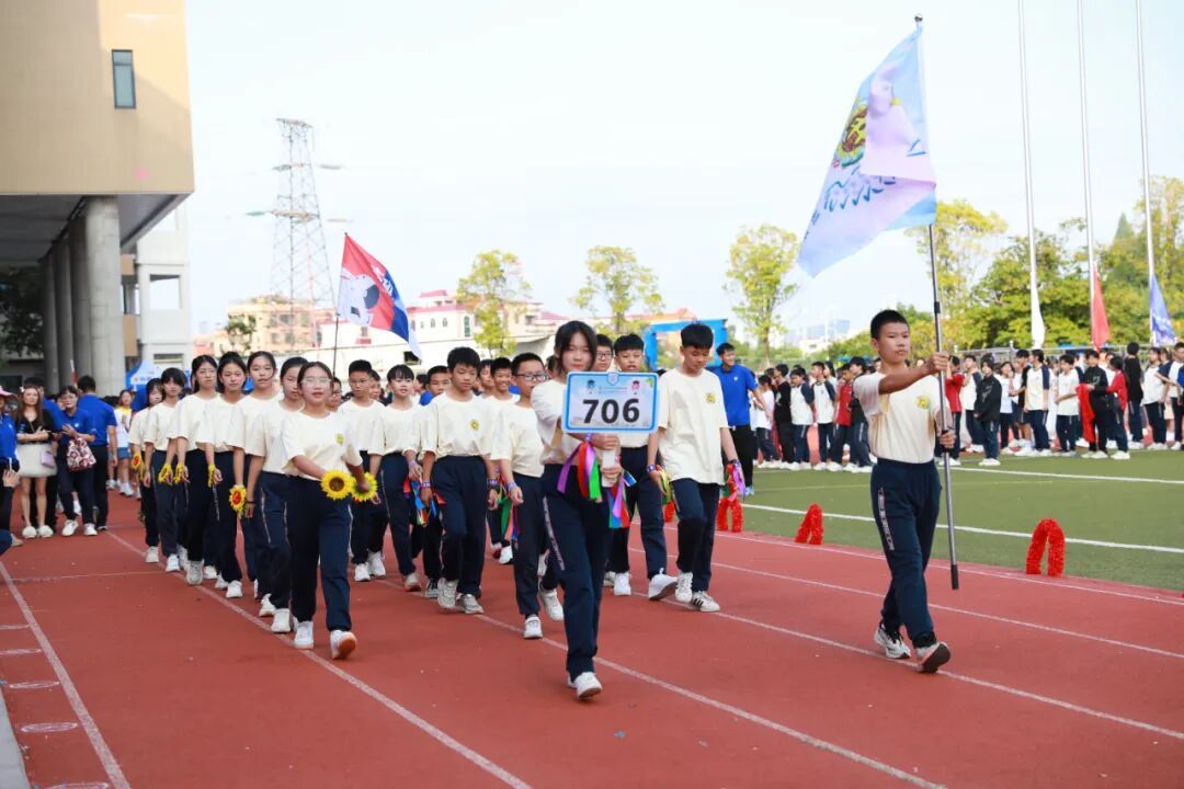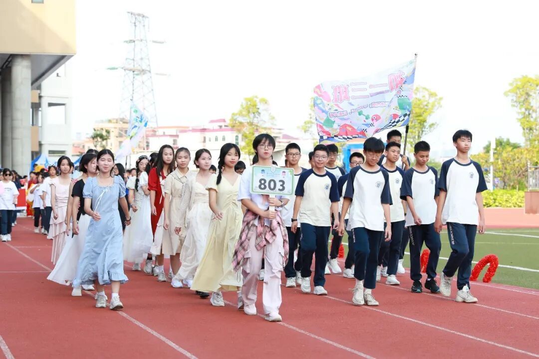 风华正茂,以凌云之志逐赛场。初二学子已褪去青涩,更多了一份“肩能担风浪,步履自昂扬”的底气与担当。他们队列如流动星河,步伐似青春鼓点,正以奋进之姿,诠释着加美少年的风华正茂。