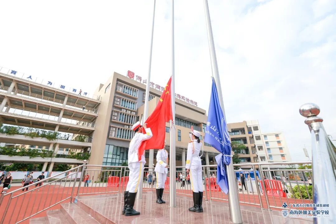 在庄严的国歌声中,全场领导、嘉宾、师生肃立行礼,注视着五星红旗冉冉升起。这一刻,家国情怀深深植根于每个加美人的心中。