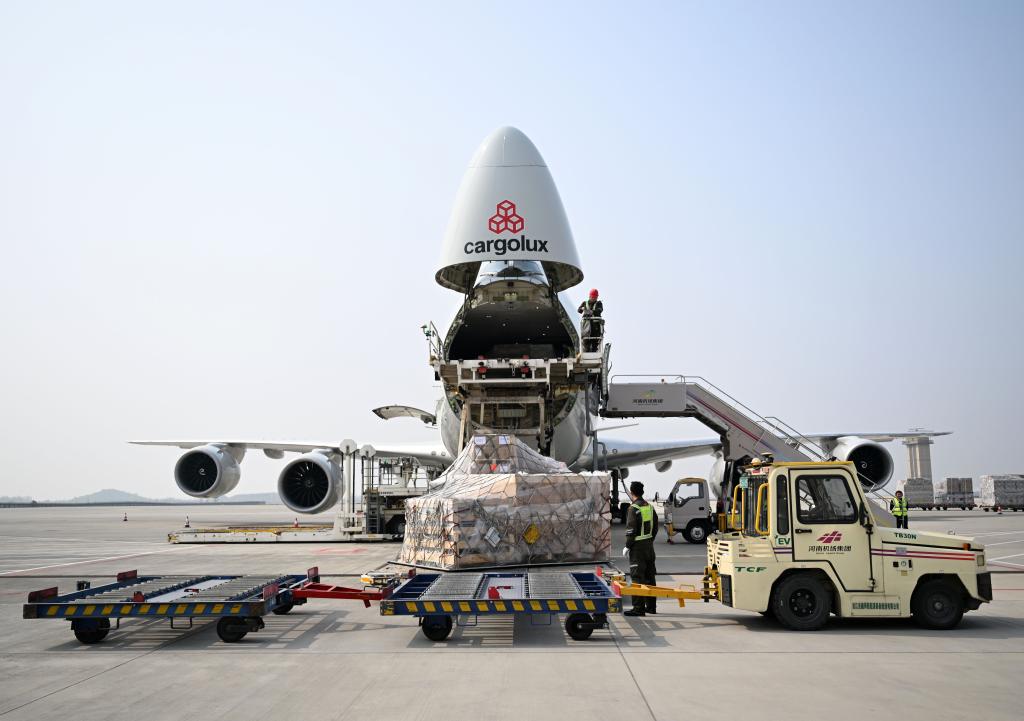 2026年3月31日,工作人员在郑州新郑国际机场为一架卢森堡货航货机卸货。新华社记者 李嘉南 摄